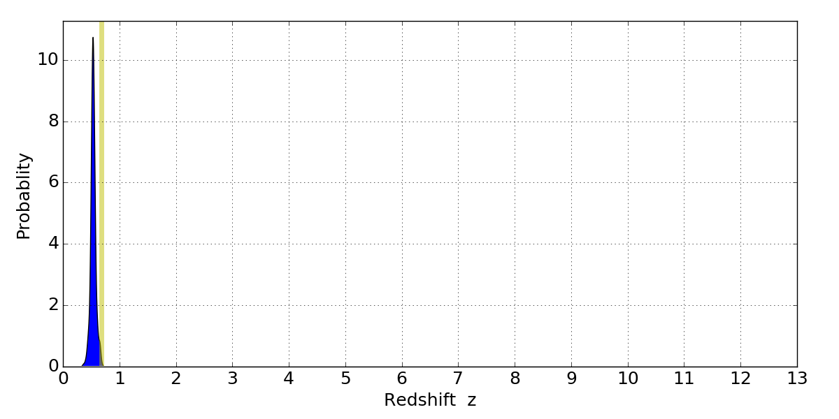 In P(z) plots: Yellow lines mark the cluster redshift z = 0.677,