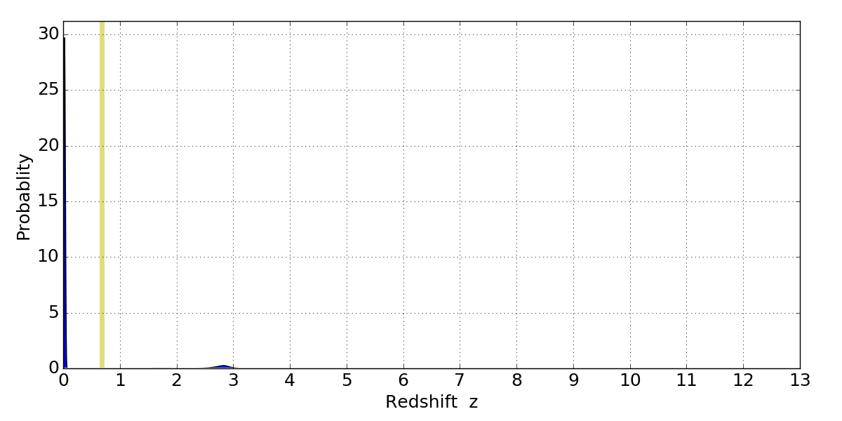 In P(z) plots: Yellow lines mark the cluster redshift z = 0.677,