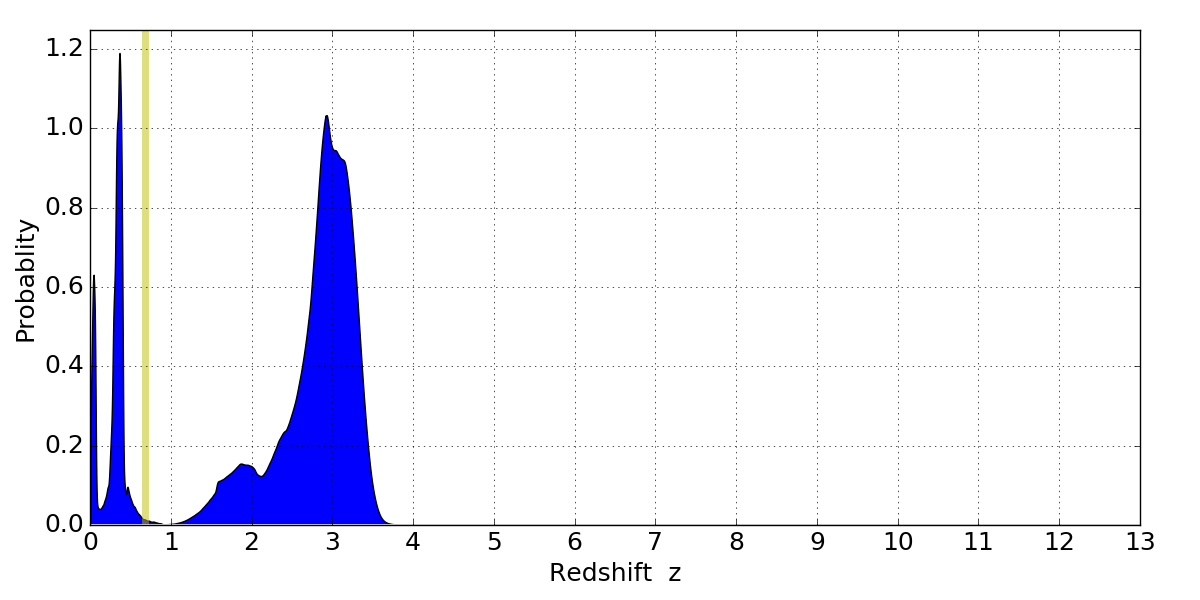 In P(z) plots: Yellow lines mark the cluster redshift z = 0.677,