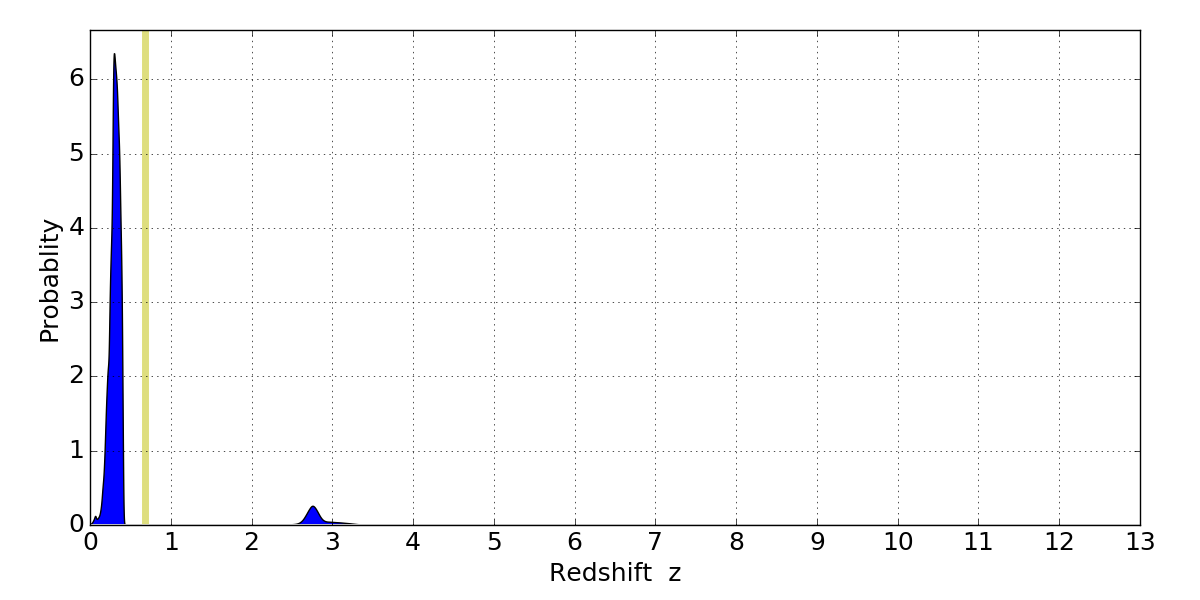 In P(z) plots: Yellow lines mark the cluster redshift z = 0.677,