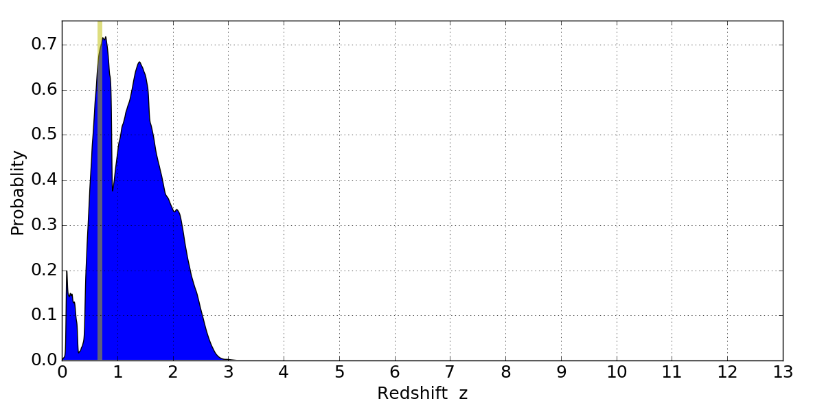 In P(z) plots: Yellow lines mark the cluster redshift z = 0.677,