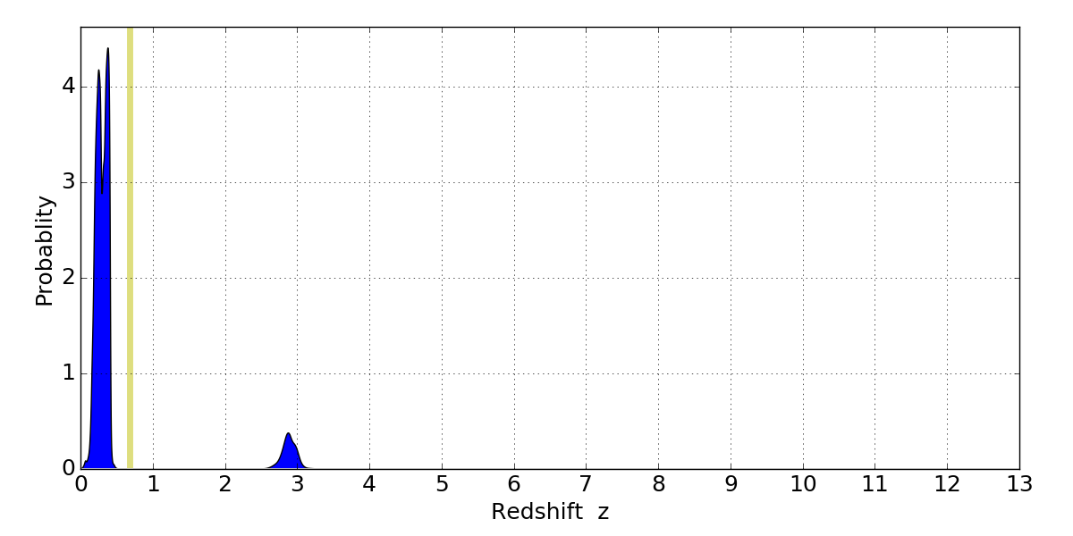 In P(z) plots: Yellow lines mark the cluster redshift z = 0.677,