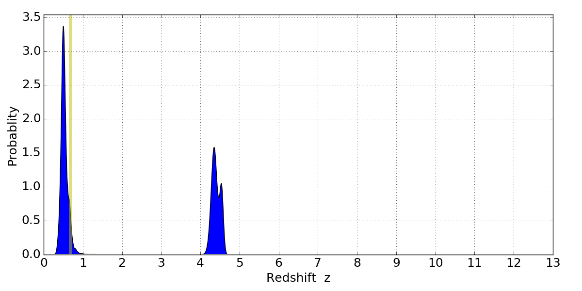 In P(z) plots: Yellow lines mark the cluster redshift z = 0.677,