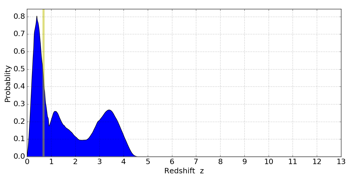 In P(z) plots: Yellow lines mark the cluster redshift z = 0.677,
