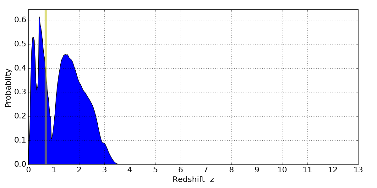 In P(z) plots: Yellow lines mark the cluster redshift z = 0.677,