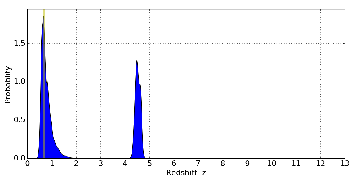 In P(z) plots: Yellow lines mark the cluster redshift z = 0.677,
