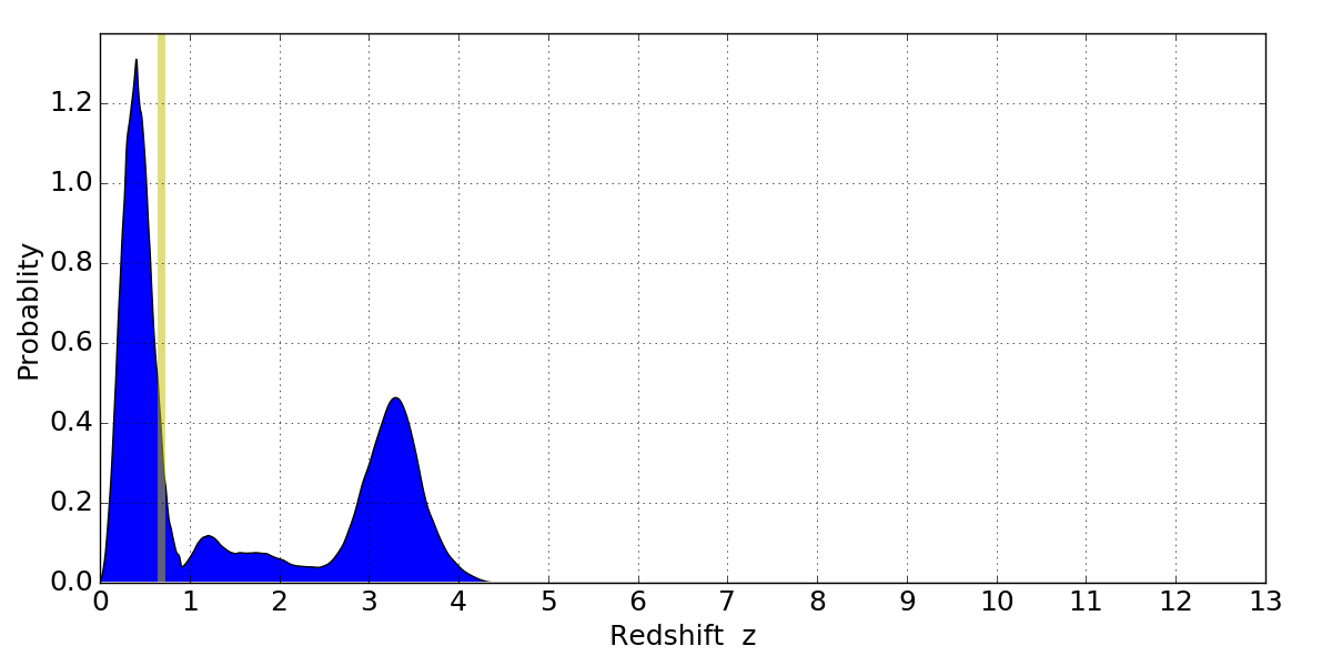 In P(z) plots: Yellow lines mark the cluster redshift z = 0.677,