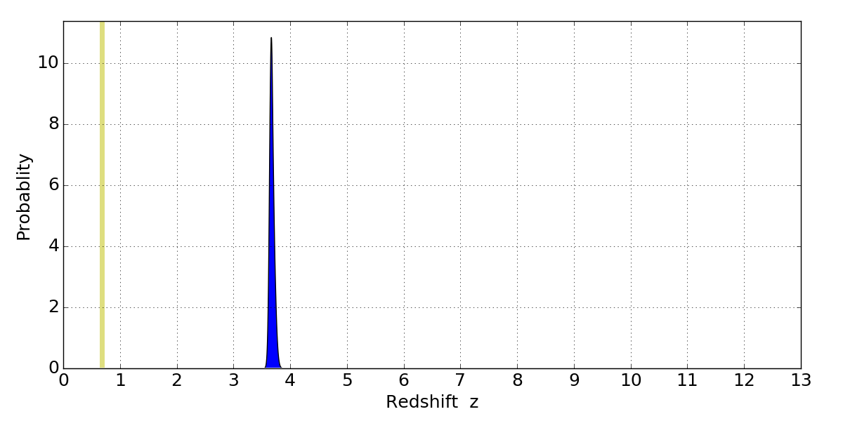 In P(z) plots: Yellow lines mark the cluster redshift z = 0.677,