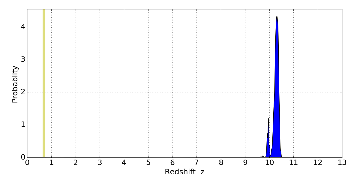 In P(z) plots: Yellow lines mark the cluster redshift z = 0.677,