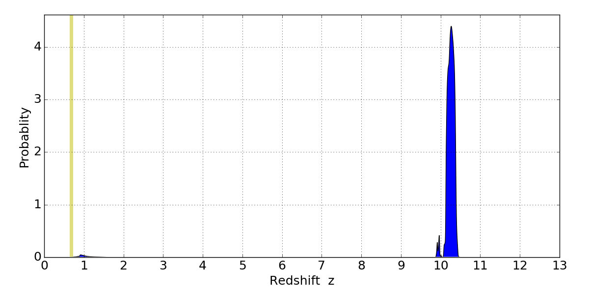 In P(z) plots: Yellow lines mark the cluster redshift z = 0.677,