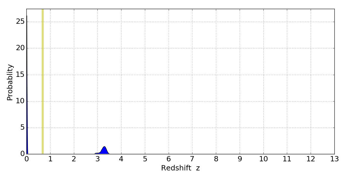 In P(z) plots: Yellow lines mark the cluster redshift z = 0.677,