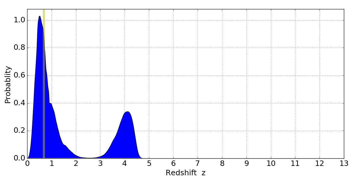 In P(z) plots: Yellow lines mark the cluster redshift z = 0.677,