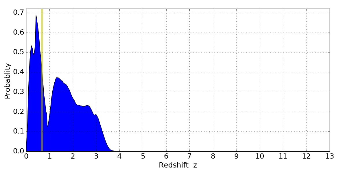 In P(z) plots: Yellow lines mark the cluster redshift z = 0.677,
