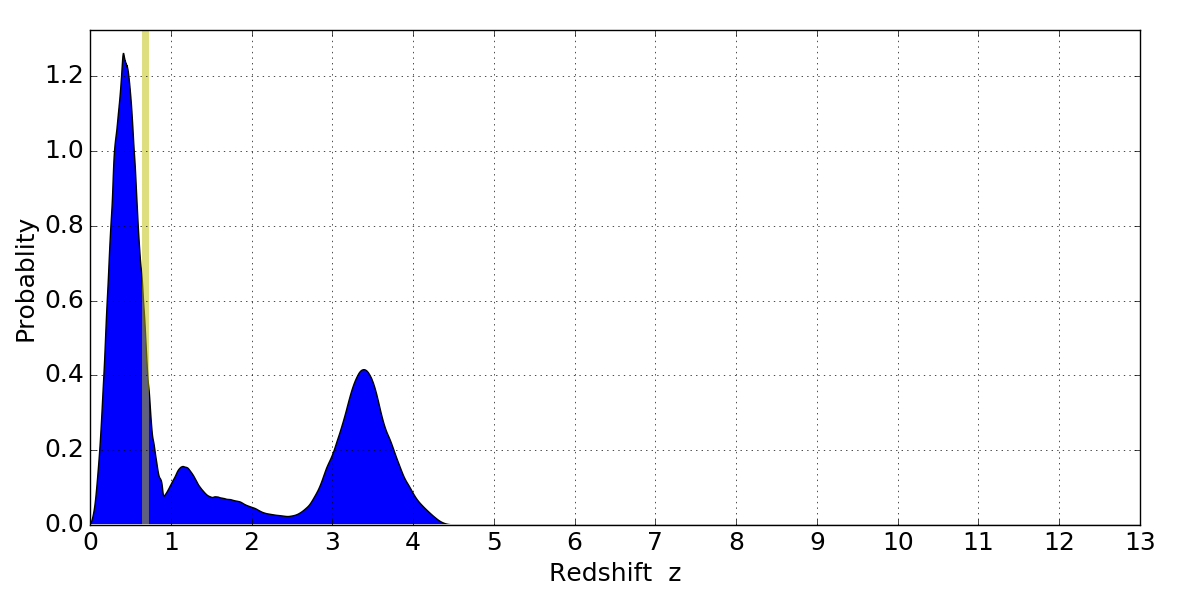In P(z) plots: Yellow lines mark the cluster redshift z = 0.677,