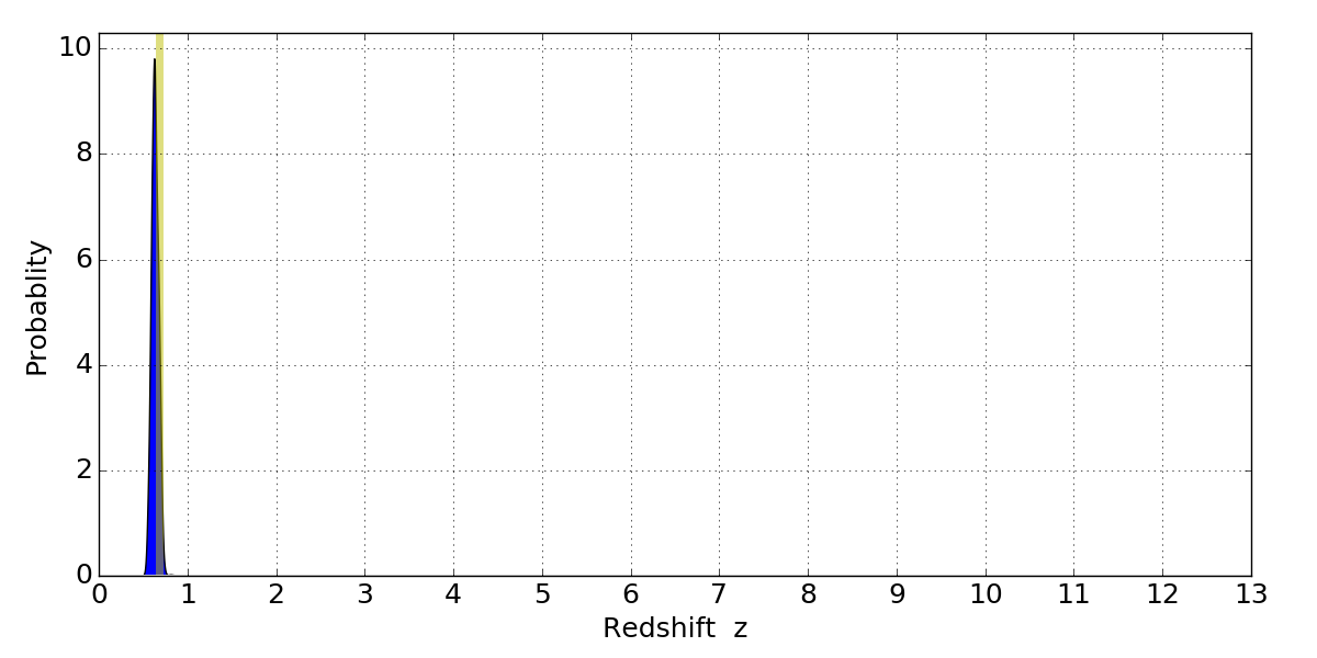In P(z) plots: Yellow lines mark the cluster redshift z = 0.677,