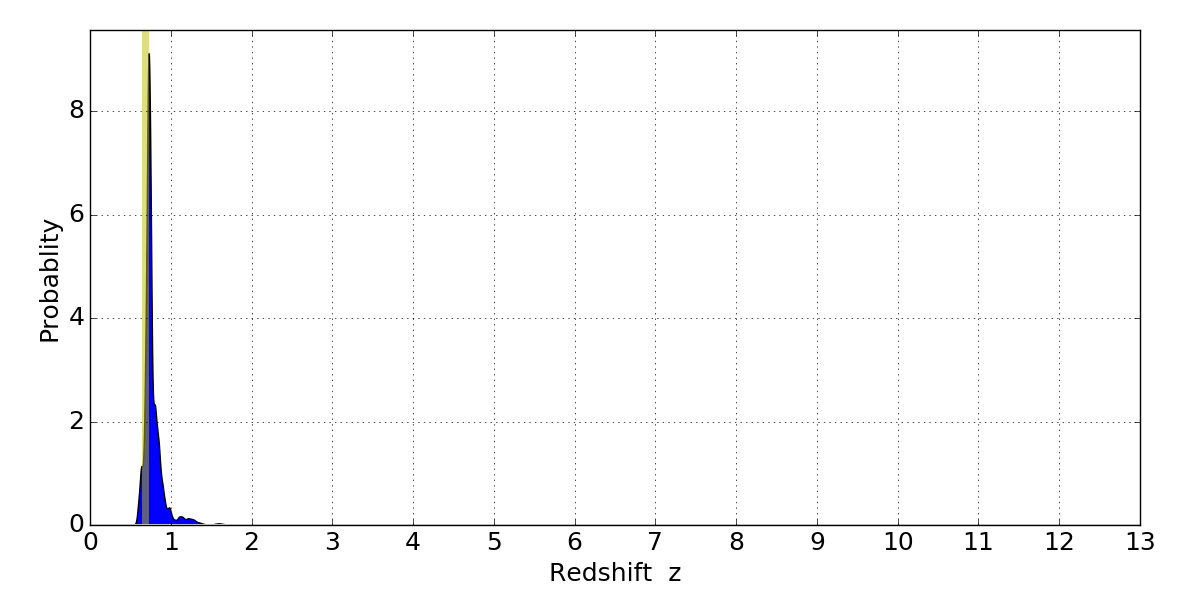 In P(z) plots: Yellow lines mark the cluster redshift z = 0.677,