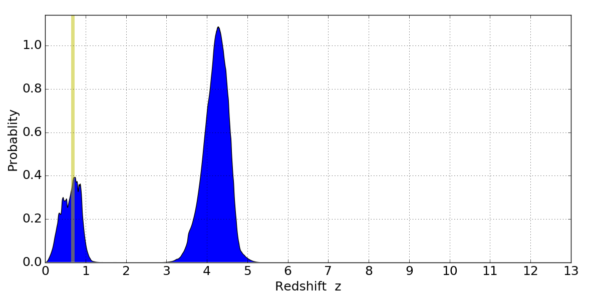 In P(z) plots: Yellow lines mark the cluster redshift z = 0.677,