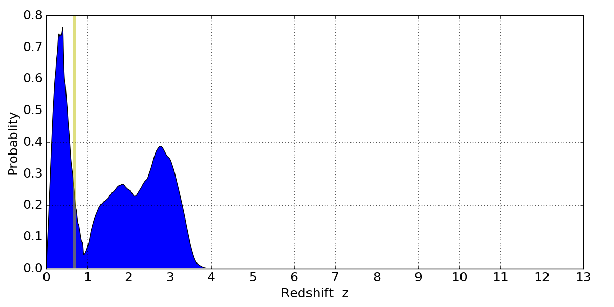 In P(z) plots: Yellow lines mark the cluster redshift z = 0.677,