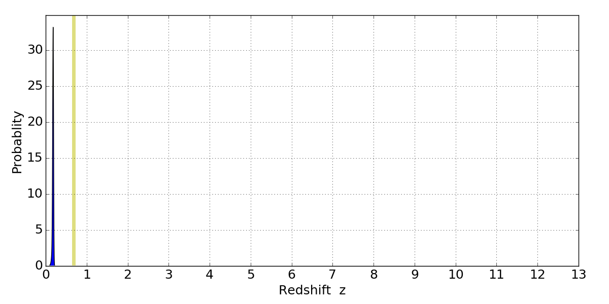 In P(z) plots: Yellow lines mark the cluster redshift z = 0.677,