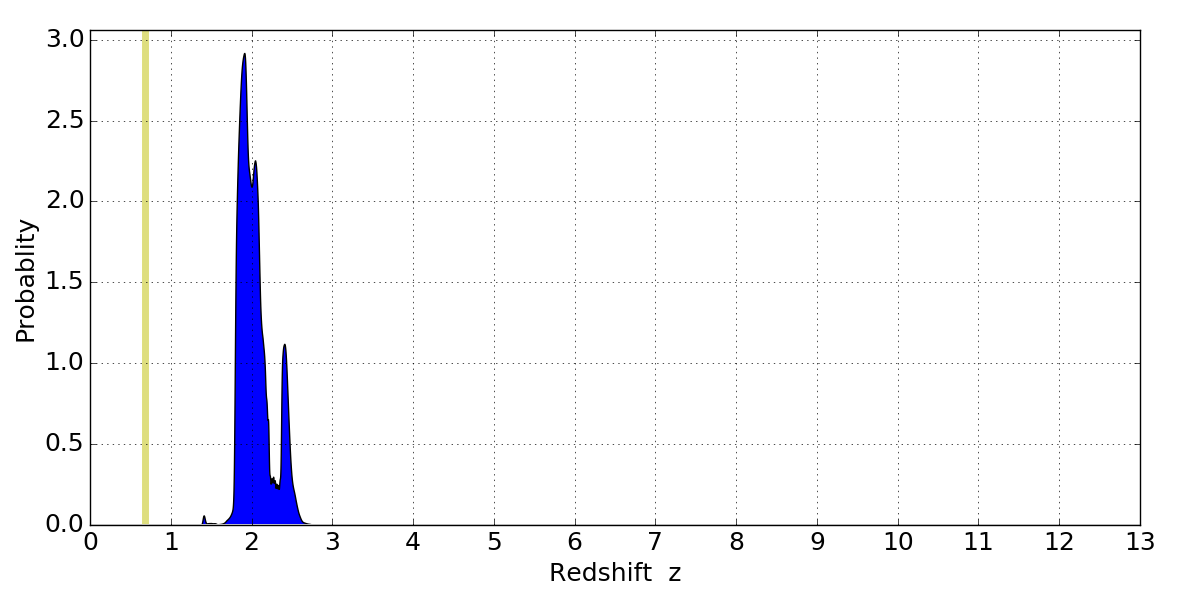 In P(z) plots: Yellow lines mark the cluster redshift z = 0.677,