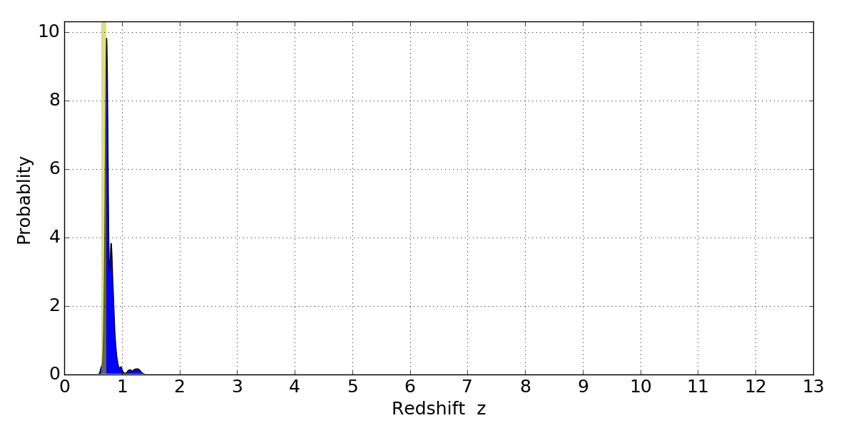 In P(z) plots: Yellow lines mark the cluster redshift z = 0.677,