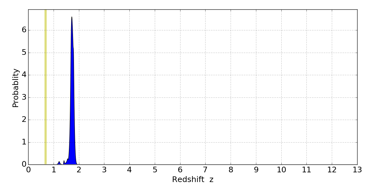 In P(z) plots: Yellow lines mark the cluster redshift z = 0.677,