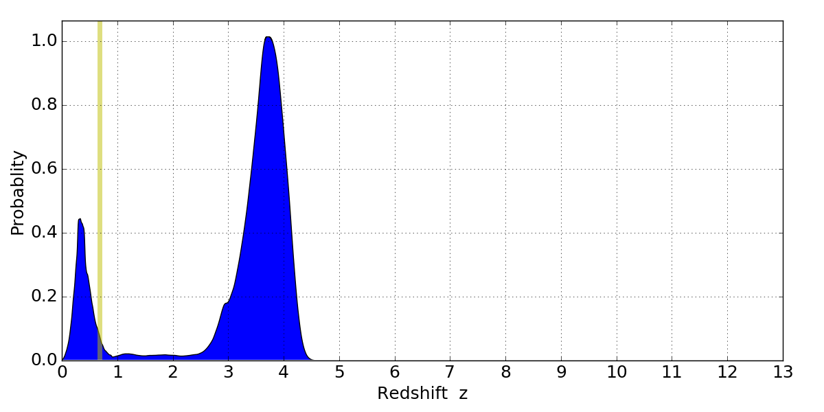 In P(z) plots: Yellow lines mark the cluster redshift z = 0.677,