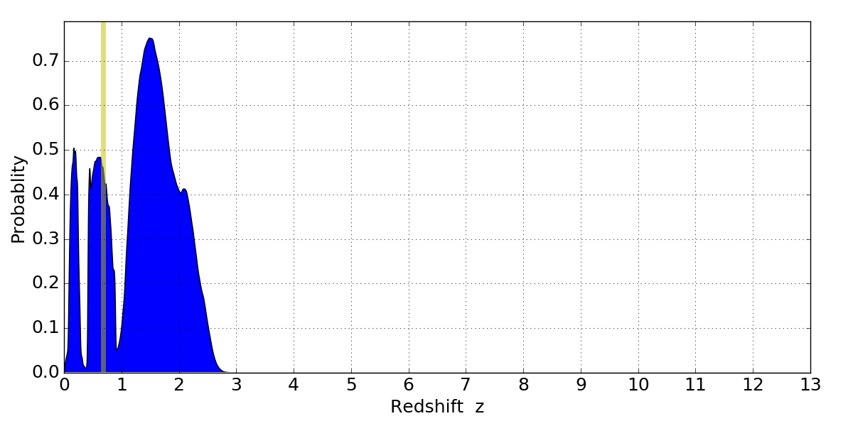 In P(z) plots: Yellow lines mark the cluster redshift z = 0.677,