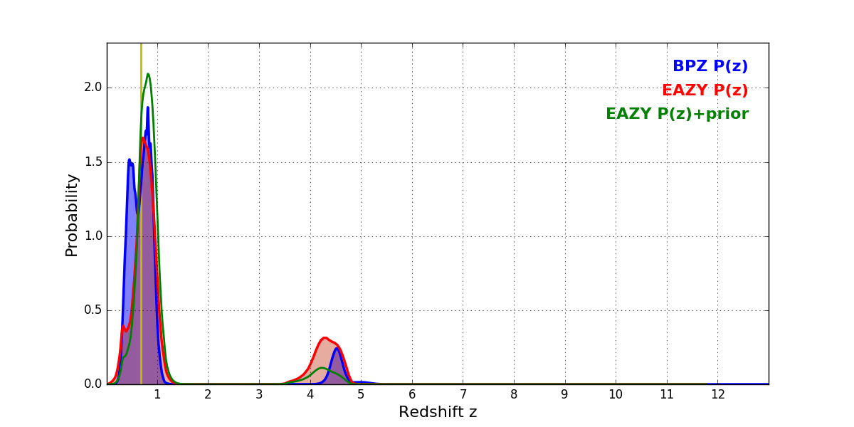 In P(z) plots: Yellow lines mark the cluster redshift z = 0.677,