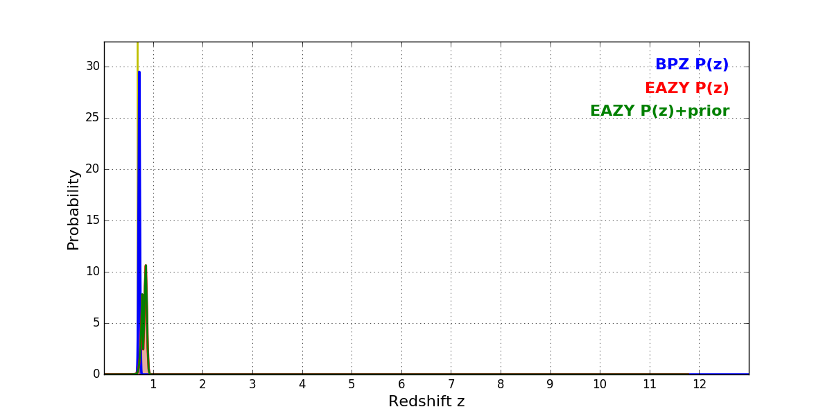 In P(z) plots: Yellow lines mark the cluster redshift z = 0.677,