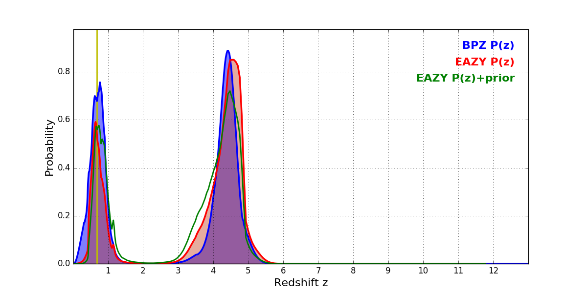 In P(z) plots: Yellow lines mark the cluster redshift z = 0.677,