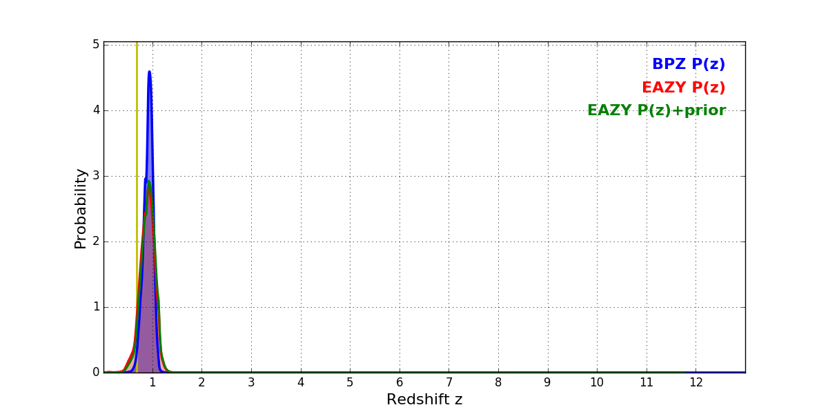 In P(z) plots: Yellow lines mark the cluster redshift z = 0.677,