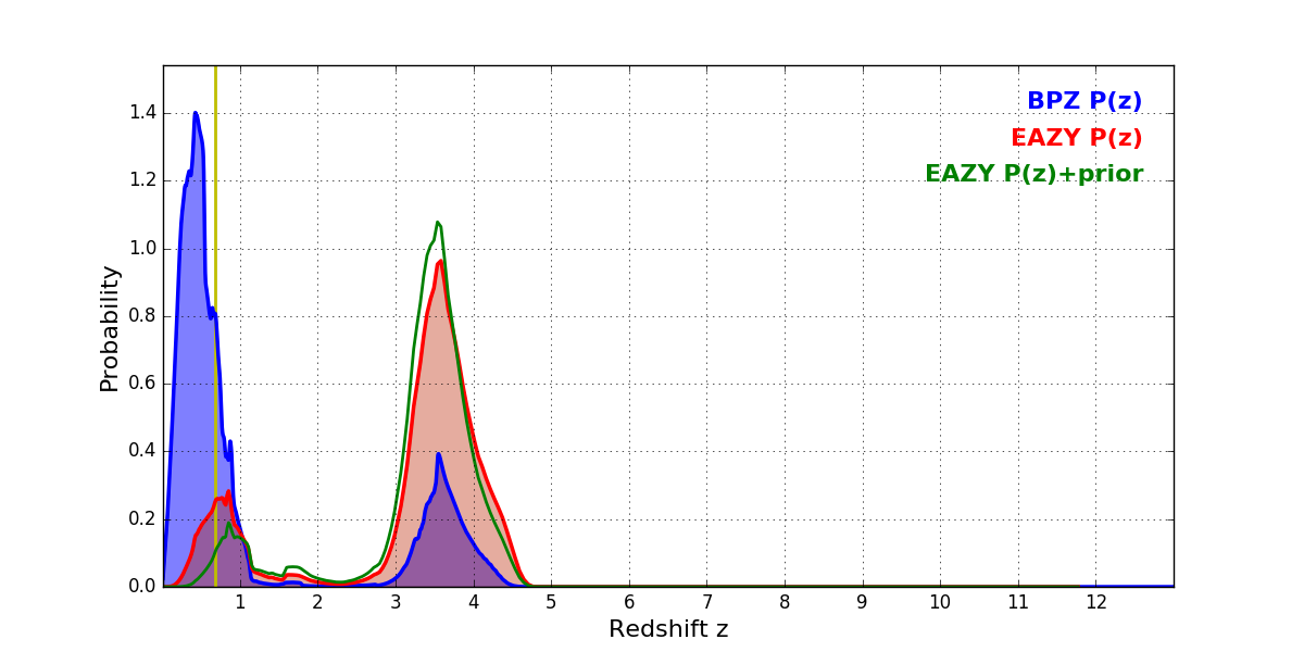 In P(z) plots: Yellow lines mark the cluster redshift z = 0.677,