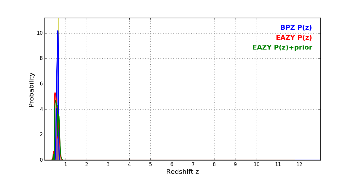 In P(z) plots: Yellow lines mark the cluster redshift z = 0.677,