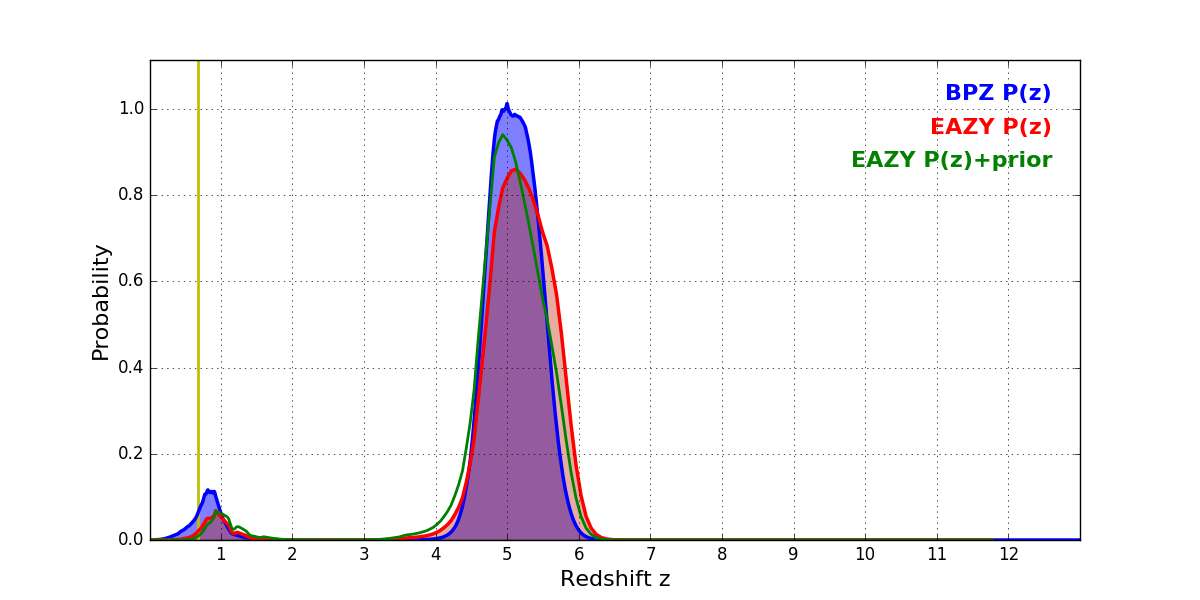 In P(z) plots: Yellow lines mark the cluster redshift z = 0.677,