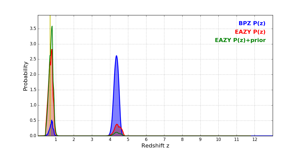 In P(z) plots: Yellow lines mark the cluster redshift z = 0.677,