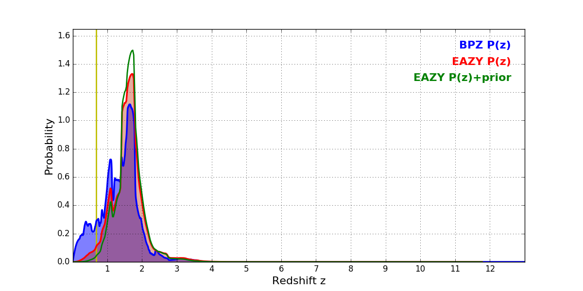 In P(z) plots: Yellow lines mark the cluster redshift z = 0.677,