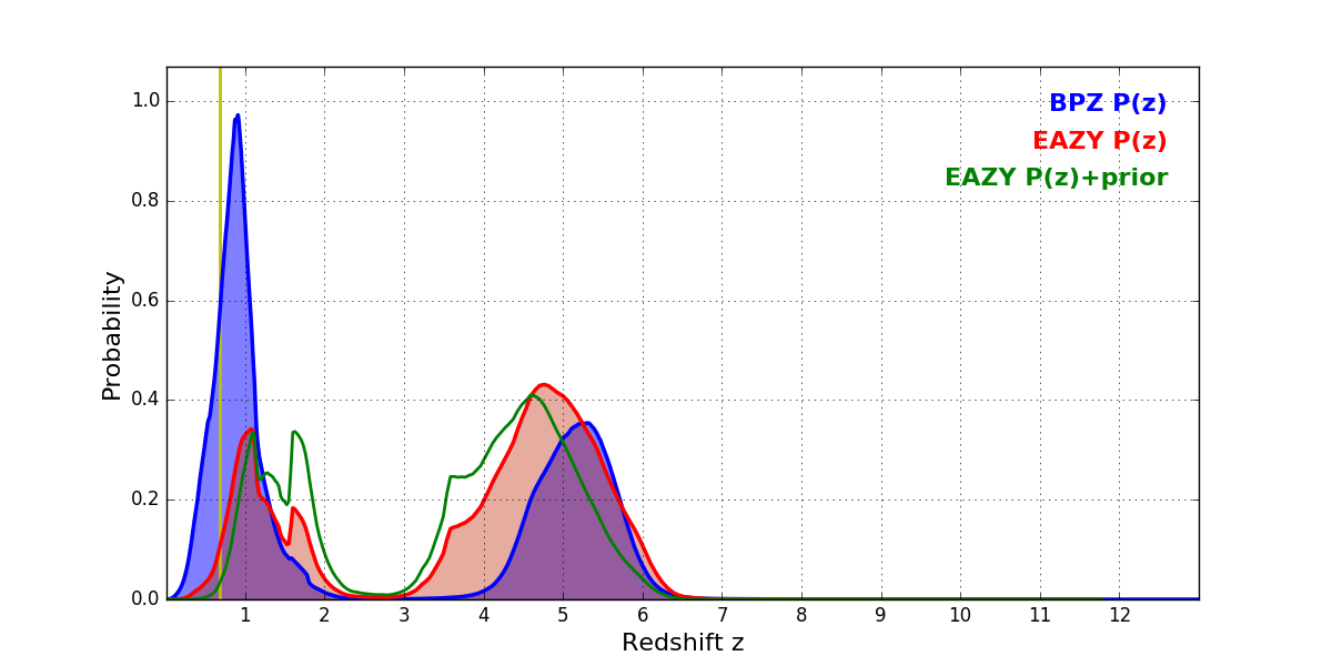 In P(z) plots: Yellow lines mark the cluster redshift z = 0.677,
