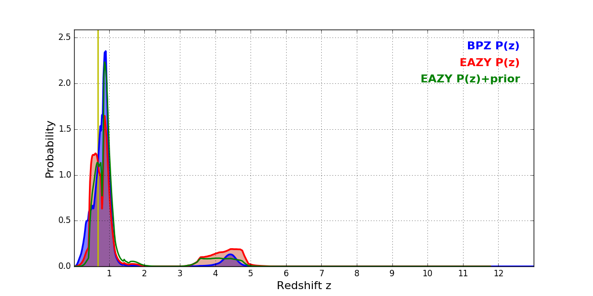 In P(z) plots: Yellow lines mark the cluster redshift z = 0.677,