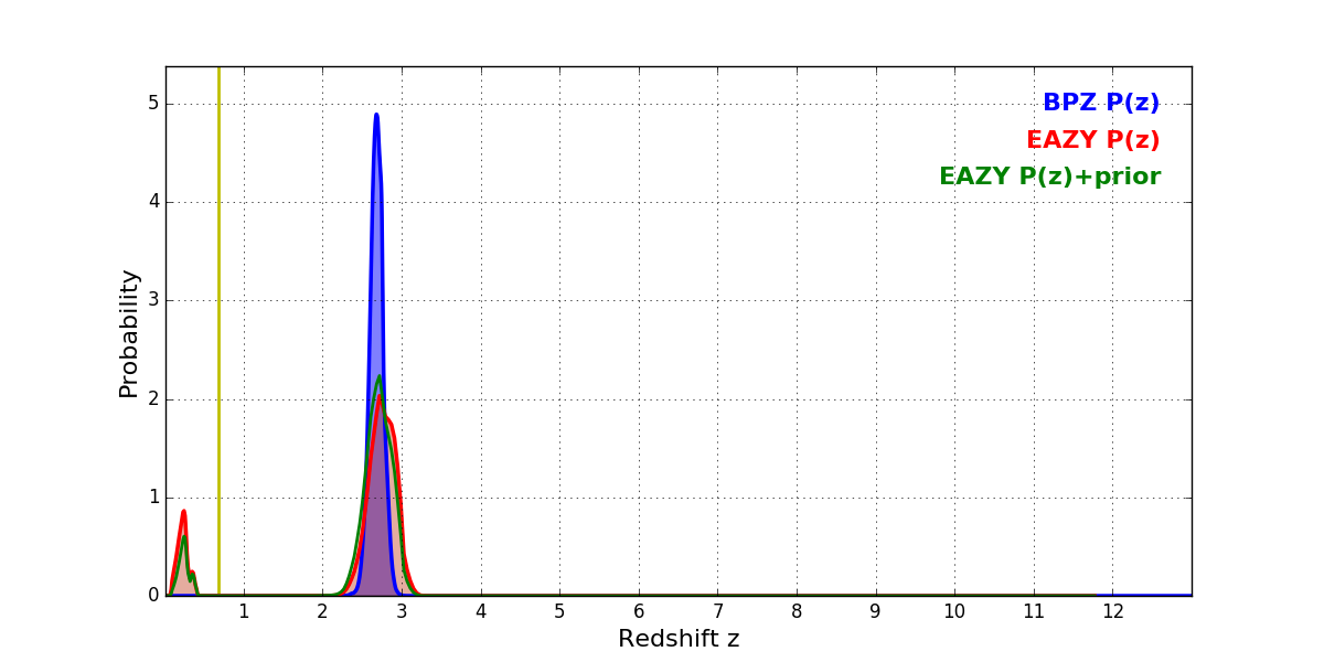 In P(z) plots: Yellow lines mark the cluster redshift z = 0.677,