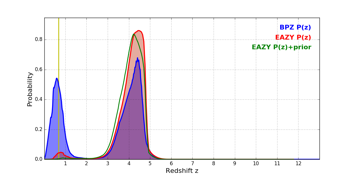 In P(z) plots: Yellow lines mark the cluster redshift z = 0.677,