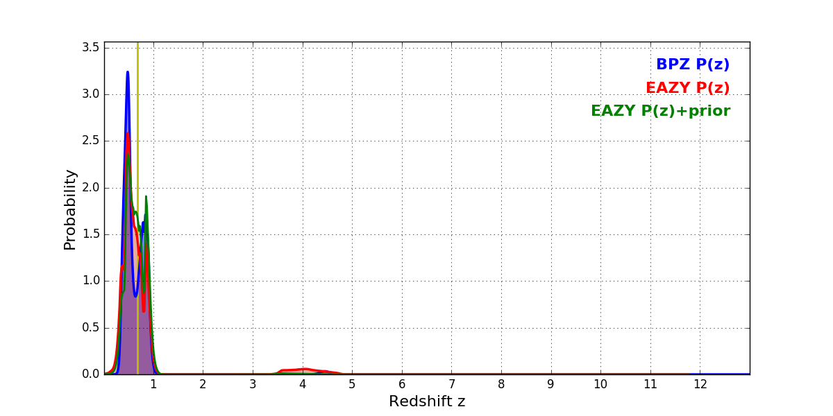 In P(z) plots: Yellow lines mark the cluster redshift z = 0.677,