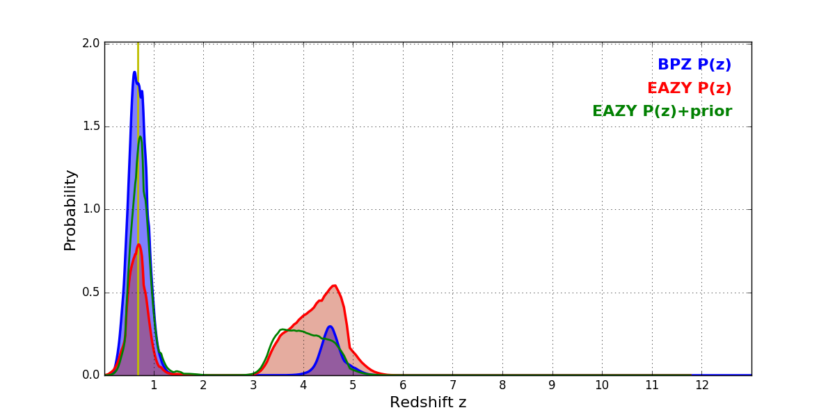 In P(z) plots: Yellow lines mark the cluster redshift z = 0.677,