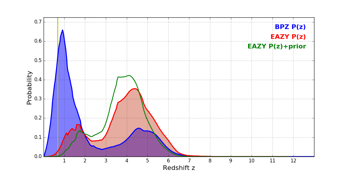 In P(z) plots: Yellow lines mark the cluster redshift z = 0.677,