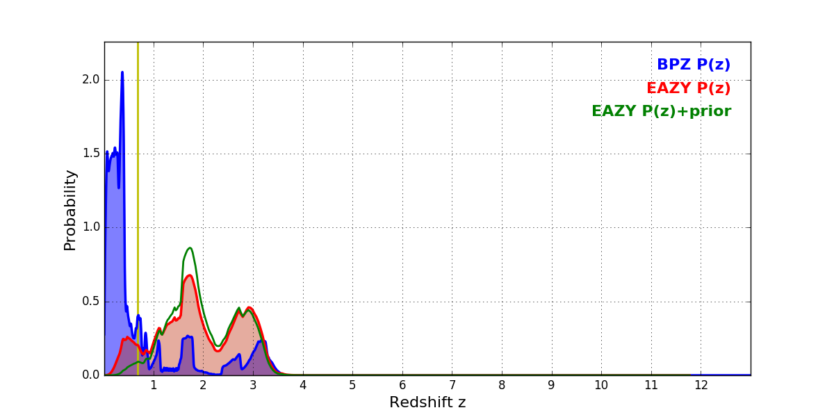 In P(z) plots: Yellow lines mark the cluster redshift z = 0.677,