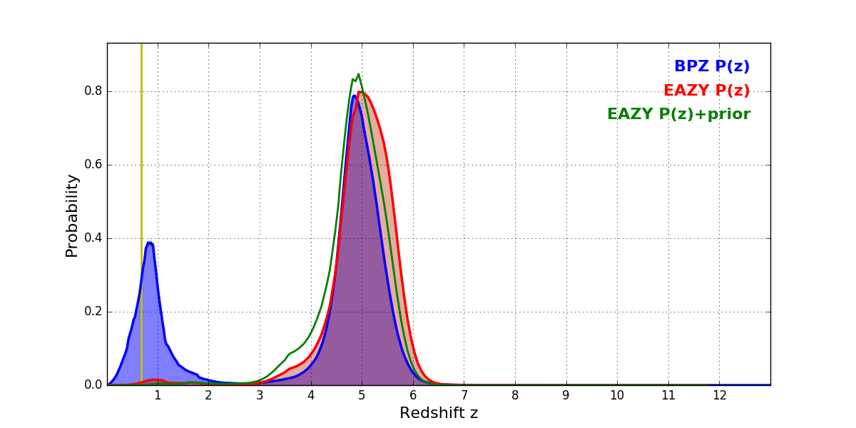 In P(z) plots: Yellow lines mark the cluster redshift z = 0.677,
