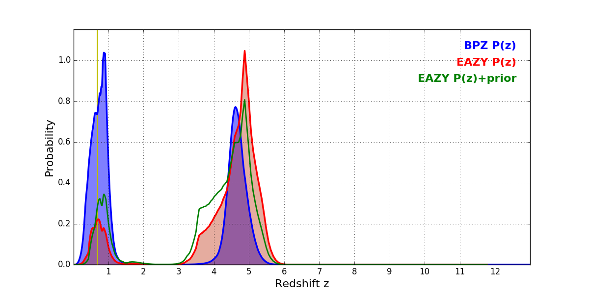 In P(z) plots: Yellow lines mark the cluster redshift z = 0.677,