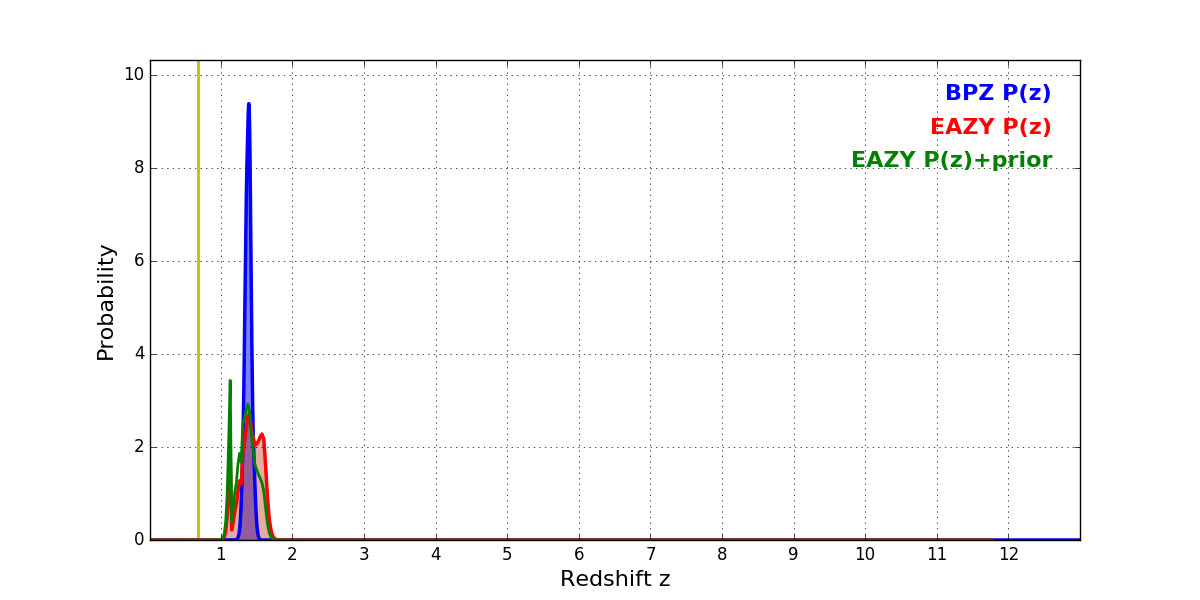 In P(z) plots: Yellow lines mark the cluster redshift z = 0.677,