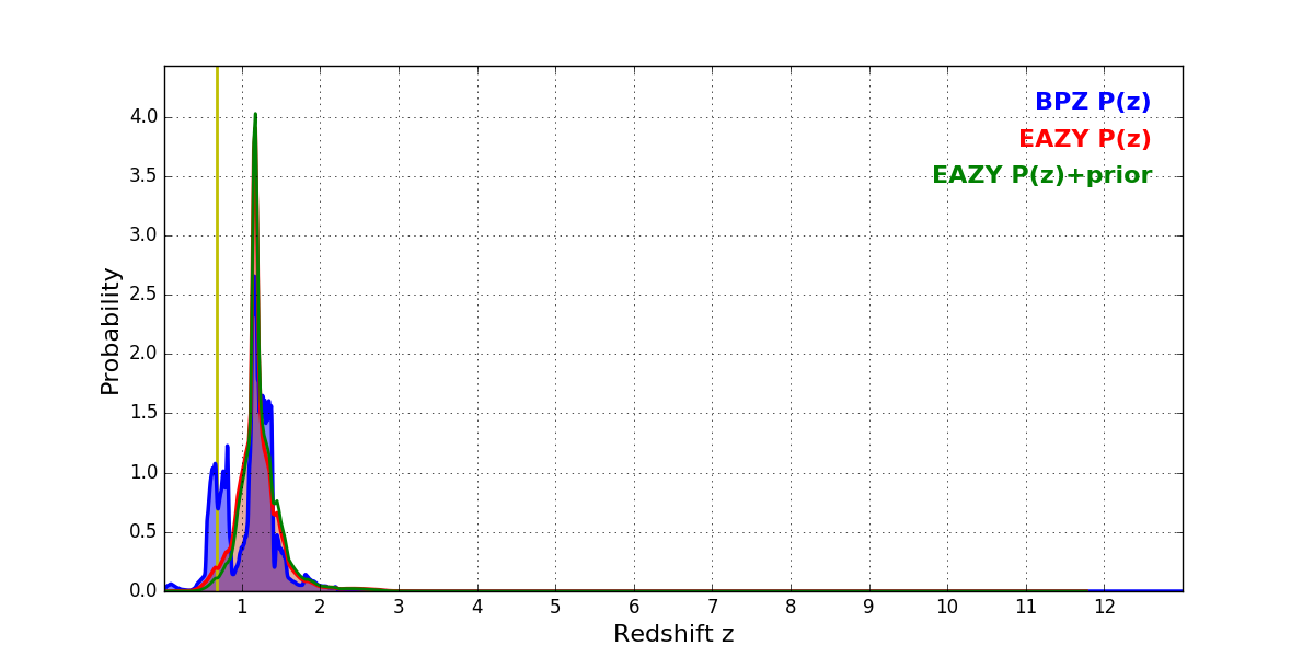 In P(z) plots: Yellow lines mark the cluster redshift z = 0.677,