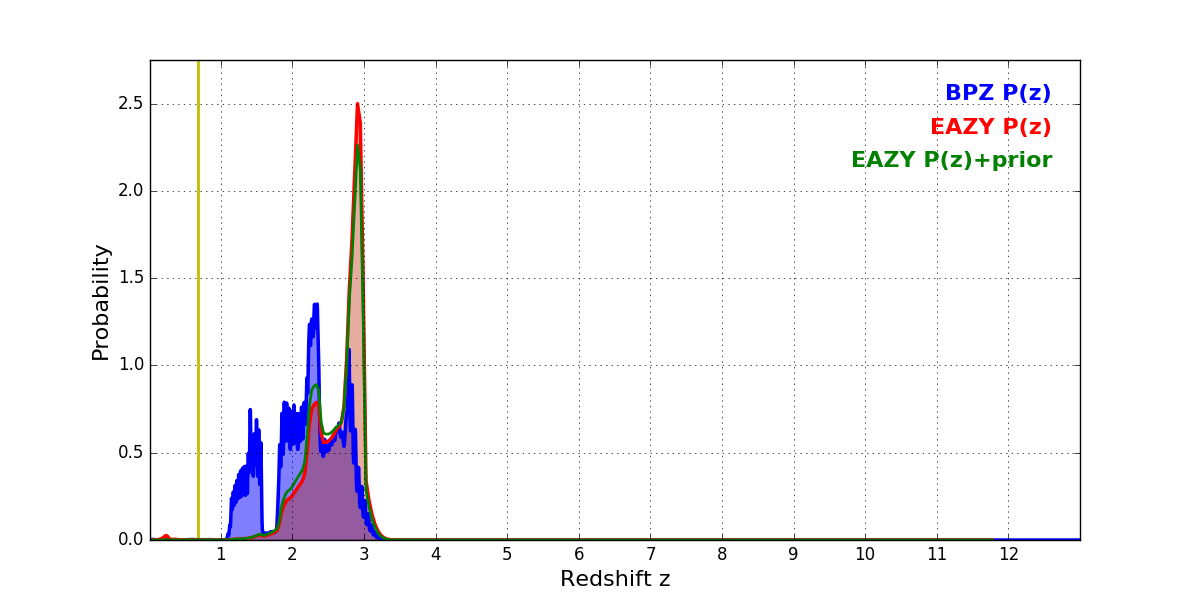 In P(z) plots: Yellow lines mark the cluster redshift z = 0.677,
